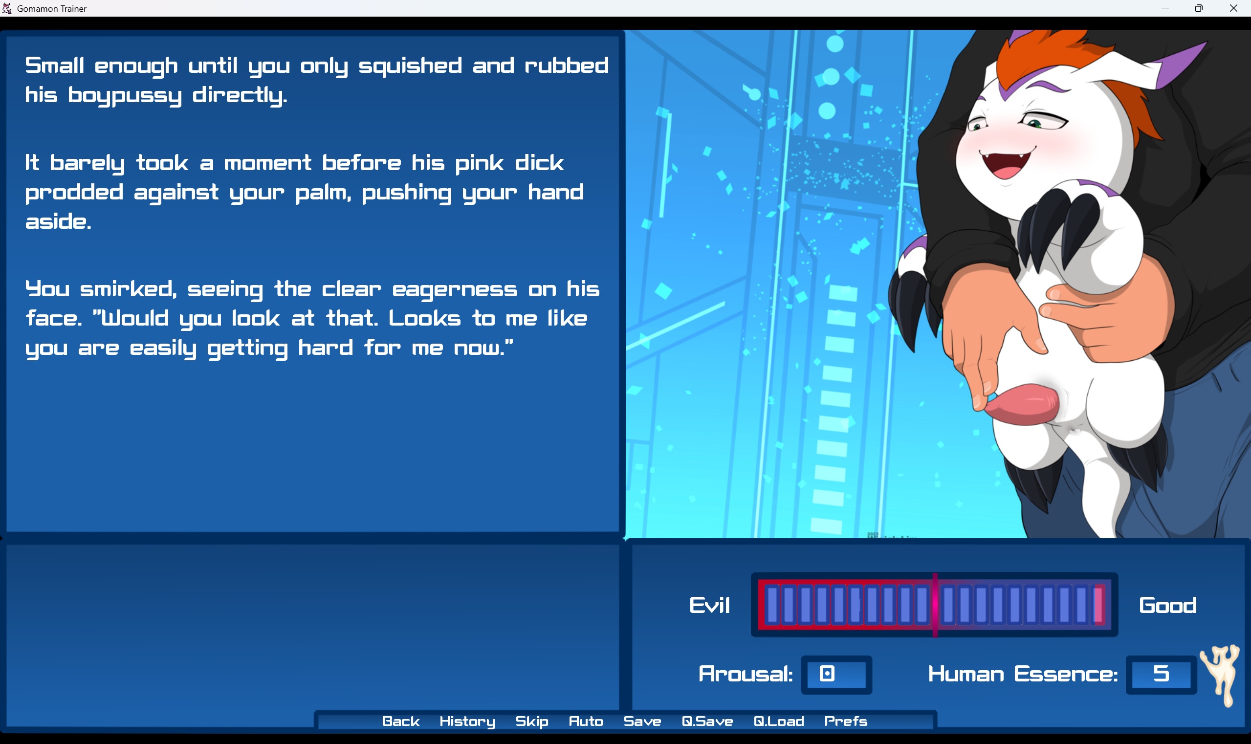Secret Lover Slut Ending: To unlock this Ending you need to have seen the three Special Scenes. Bodyjob is the first one. To get it you need to cum outside in the Clawjob Scene twice. This unlocks the Blowjob Scene early. Cum outside here once. Then type a few times on the main screen with the buttons and the "...". This scene cannot be done after passing the First Firewall. The Thighjob Scene follows next. And it requires to have viewed the Bodyjob Scene, to have discovered the Second Firewall and to have saved or attempted to save Gomamon at every Digimon encounter. Not to mention a large blue good bar. Lastly follows the Armpitjob. To get this scene, you need to have viewed the Thighjob, while also having discovered the Third Firewall with 5 Human Essences without going through it. Lastly the "Good Bar" needs be filled so much that Gomamon has hearts seen by his head. After having triggered all three scenes you will get the Secret Lover Slut Ending which can be considered the Canon Ending.